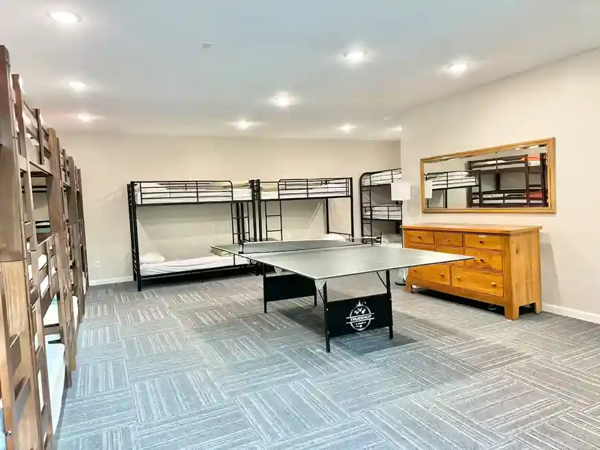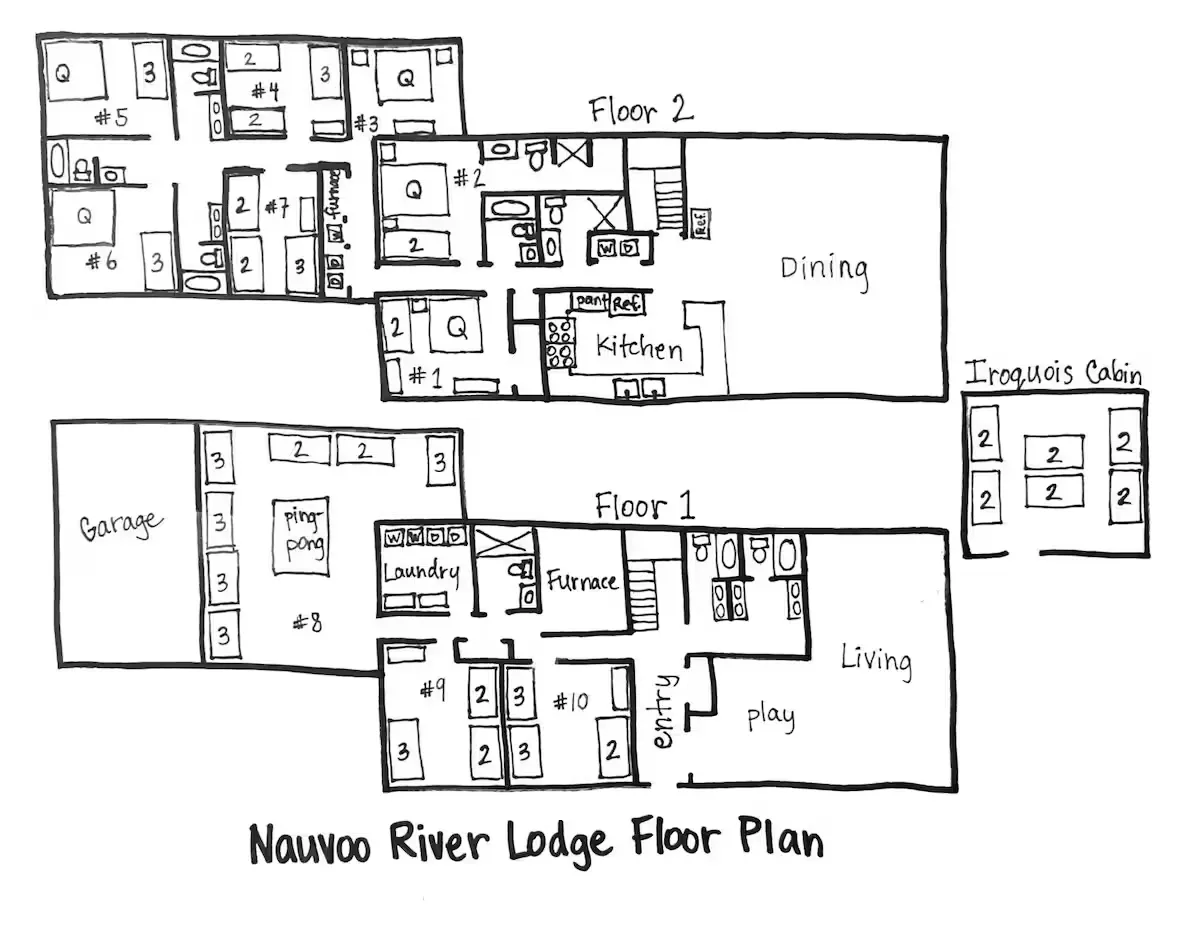 You will have 6300 sq ft of space that sleeps 80 people in 11 sleeping spaces, with a total of 9 bathrooms. 300 of these sq ft--one of the sleeping spaces--is a detached original YMCA camp cabin that has been fully remodeled with electricity and heating/cooling.