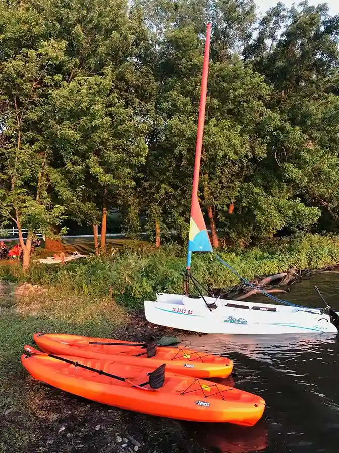 River-front property for your gatherings and water fun is included, with: fire pit, large grassy area, shade trees, and small beach. S'mores and lightning-bug capturing can be a nightly activity (lots of on-site wood for your fire)! Several watercrafts (Jon boat rated for 8 people, Hobie catamaran sail boat, 2 kayaks, 2 vintage aluminum canoes, 2 inflatable boats, several inner tubes) available on site for rent. Several life jackets (20), camp chairs (12), & s'mores sticks (8) available for your use.