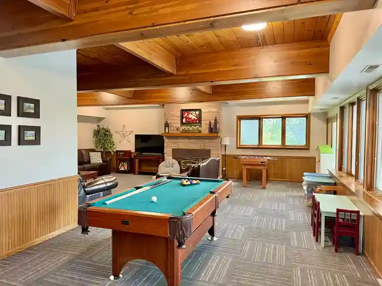 Lots of puzzles and games in an upstairs cabinets. Ping-pong table, pool table, foosball table, and lots of toys in the downstairs play areas.