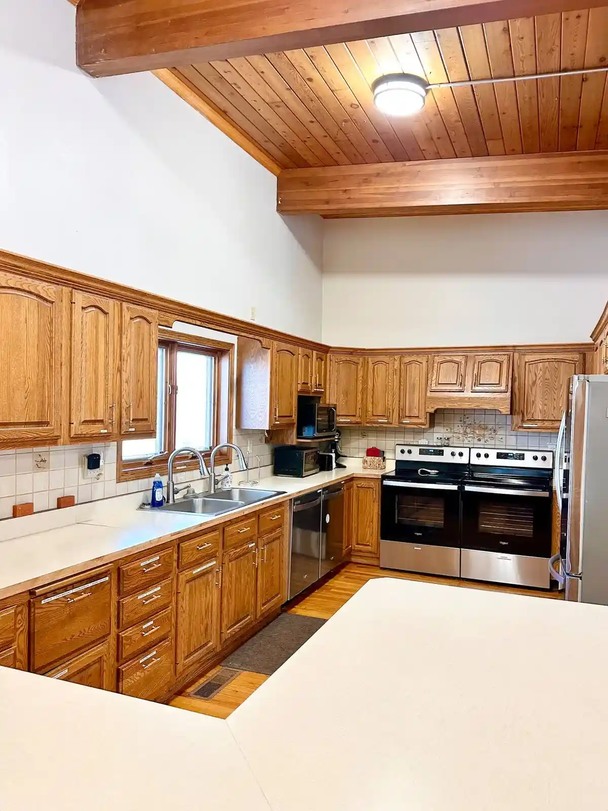 The large kitchen is equipped with 2 sinks, 2 ovens, 2 dishwashers, 2 microwaves, 2 large fridges & pantries (second pantry downstairs), and all the cooking/eating gear you could need. Small propane grill on the balcony just outside the dining room.